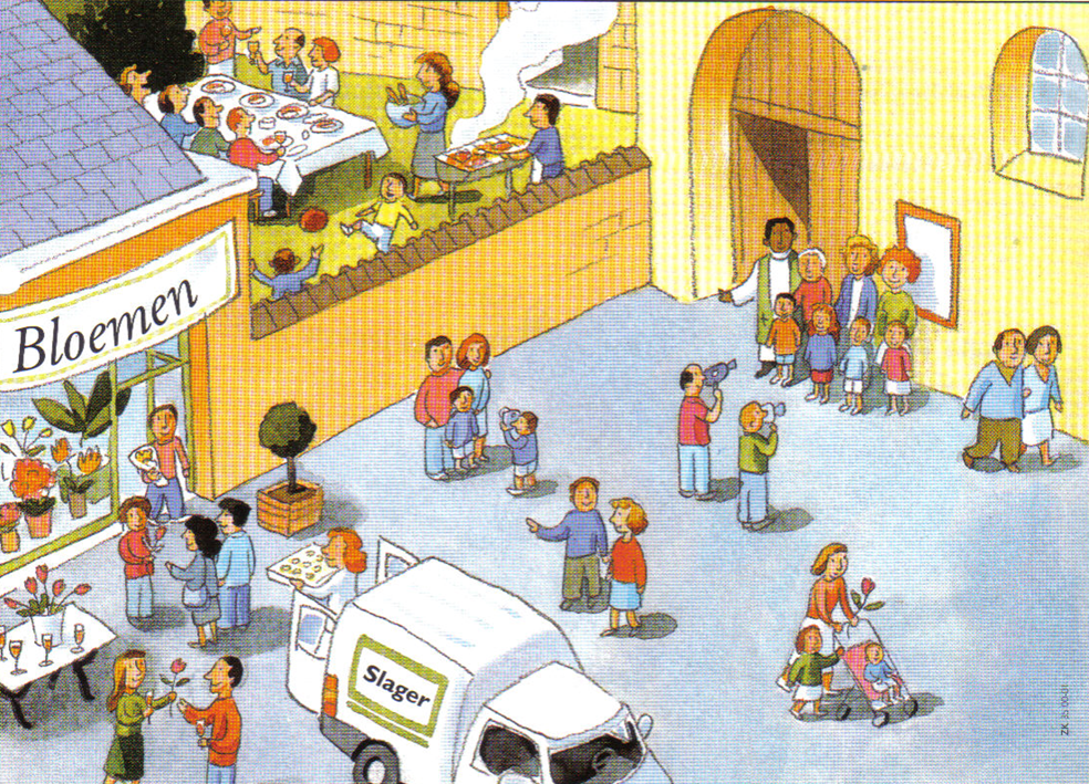 - Waaraan merk je op de prent dat het feest is? Vertel.