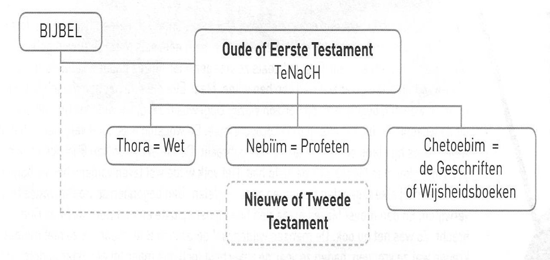 Het Oude of eerste Testament gaat over de geschiedenis van het Joodse volk. Voor de Joden is dit hun heilig boek: TeNaCh = Thora (wetten), Nebiïm (profeten) en Chetoebim (de geschriften/ wijsheidsboeken). Het Jodendom erkent Jezus niet als de Messias, dus houdt het voor hen op bij deze verhalen.