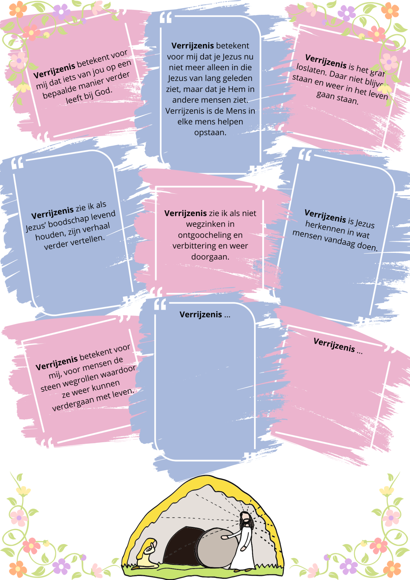 - Schrijf met je eigen woorden wat verrijzenis voor jou betekent. Je mag je baseren op de voorbeelden MAAR niet letterlijk gebruiken.