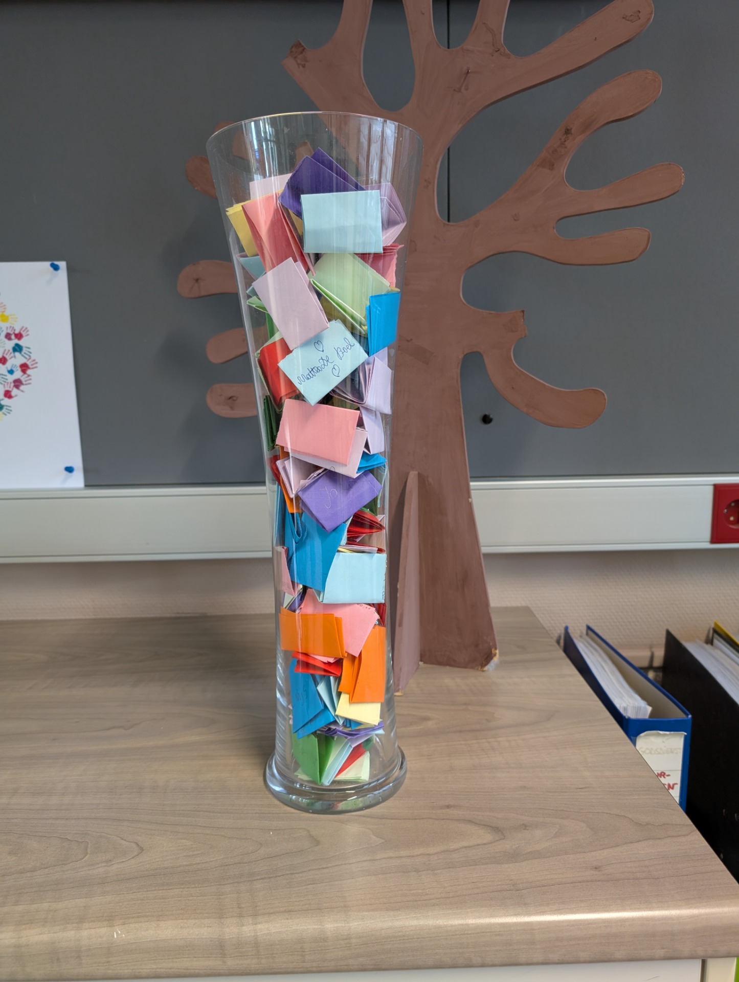 Dat schrijven we op een gekleurd briefje en stoppen dat in een glazen vaas. MEER van dat!